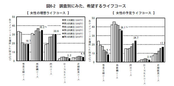 金子:仰るとおり、女性(18~34歳)の間で「理想」コースに専業主婦を選ぶ女性は、92年(第10回調査)までは約3人に1人もいました。