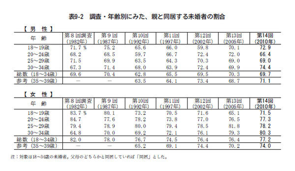 釜野: 明確に、親との「同居割合」と恋愛・結婚との相関を見てはいないのですが、親と同居する未婚者の割合は、男女とも97年以降、多少の増減はあれどほぼ全年代で「微増」傾向に。とくに30~34歳では、男性が10年に74.4%に、同女性で80.3%にも達しました。