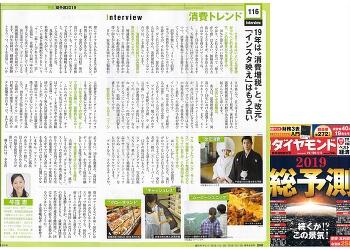 「2019年は、いよいよ消費税が10%へと引き上げられる予定。10%とキリがいい数字なので、やはりこれまでと比べて、値上がり感は大きい。価格表示の方法にもよりますが、景気が多少冷え込むのはやむを得ないでしょうね。 ~~~(中略) 大阪のホテル稼働率は日本一で、まだまだ足りない。19年冬開業の、髙島屋が百貨店で初めて手がける「シタディーン」も、小売りと宿泊との融合という意味で、~~~~」 詳しくはこちら (2018.12.22発売 「週刊ダイヤモンド」新年合併特大号・牛窪取材受)